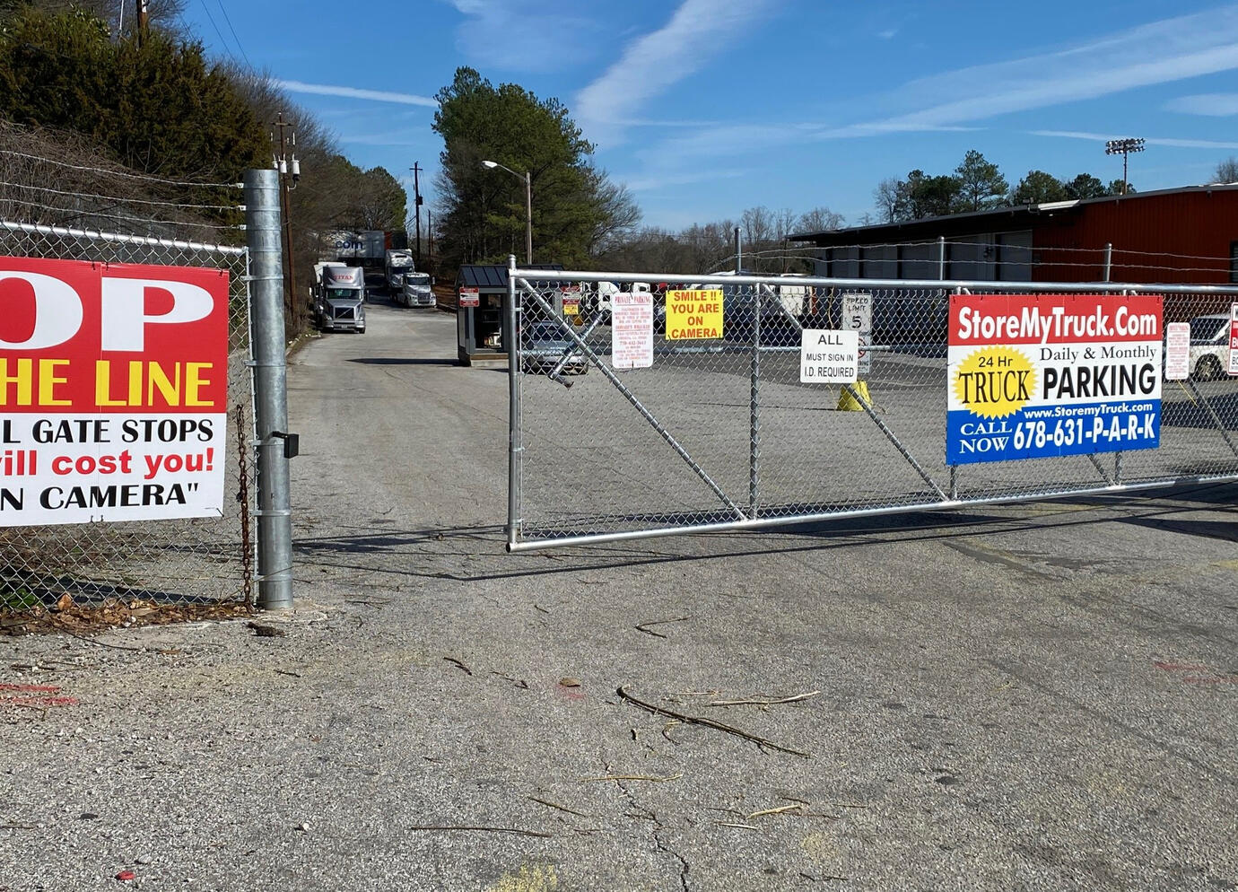 Our Lithonia, GA fenced semi truck and tractor trailer parking lots are easy to find! All you have to do is look for our StoreMyTruck.com Signage right outside the gate! Reserve a monthly big rig truck parking and storage space in Lithonia, GA with us today!